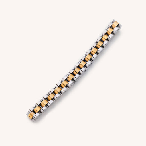 Add a touch of timeless elegance to your jewelry collection with our Mixed Metal Herringbone Bracelet. Featuring a sleek, interwoven gold and silve...