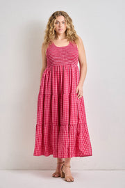 Bright, playful, and effortlessly flattering, the Gingham Maxi Dress in Fuchsia is the statement piece your wardrobe needs. Featuring a vibrant gingham print with a flowy tiered silhouette, this dress combines comfort with feminine charm. The smocked bodice provides a flexible, flattering fit while the sleeveless design keeps it cool and breathable for warm-weather days. Perfect for brunch, vacations, summer events, or casual outings, this maxi dress delivers standout style with ease.