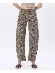 Make a bold statement with the High Rise Barrel Jeans in Leopard, designed for the woman who embraces standout style with everyday comfort. These playful yet polished jeans feature a trendy barrel-leg silhouette that tapers subtly at the ankle, creating a flattering and modern shape.