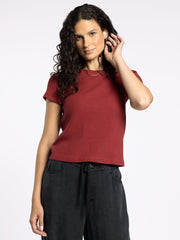 Finished with a crew neckline and cap-inspired short sleeves, the Minnie Short Sleeve offers a clean, modern look that’s easy to dress up or down. The rich crimson hue adds warmth and depth, making it a standout option for fall layering or a bold pop of color year-round. Wear it tucked into denim, styled with trousers, or layered under jackets and cardigans for effortless versatility.