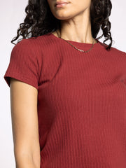 The Minnie Short Sleeve – Crimson is a refined take on the everyday tee, designed to bring both comfort and polish to your essentials lineup. Crafted from a soft ribbed knit fabric, this timeless style features a slim-fitting silhouette that flatters without feeling restrictive. Subtle raised rib detailing adds texture and visual interest, elevating this classic piece beyond a basic t-shirt.