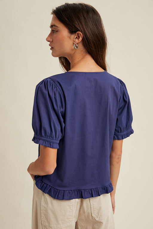This is a polka dot button-up blouse with a ruffle detail on the hem. It features puff sleeves and functional buttons. The blouse is made from 95% ...