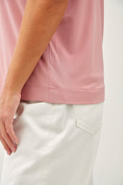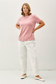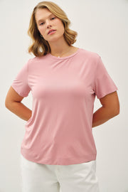 The Curvy Bamboo/Modal Basic Short Sleeve Tee in Dusty Rose is a short-sleeve, round-neck t-shirt. It's a basic, essential piece with a relaxed fit. The fabric is a bamboo/modal blend that feels soft and cool to the touch.