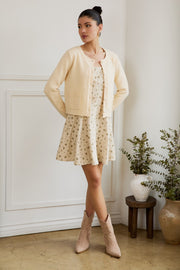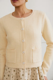 The Button Up Long Sleeve Sweater Cardigan in butter is a textured soft knit cardigan with front pockets. This cardigan is described as being very formal-looking.