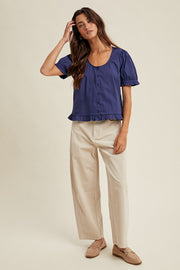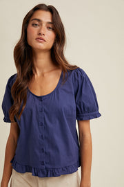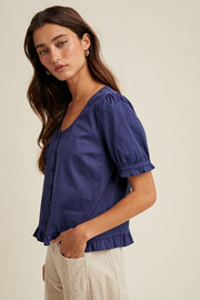 - Features: Functional buttons, puff sleeves, ruffles on hem
