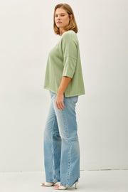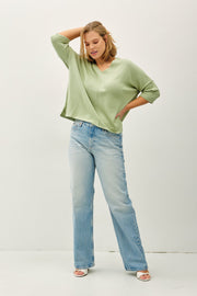 The Curvy Cotton Slub V Neck Tee is a lightweight knit tee in an applemint color. It is a plus size tee that features a V-neck and a drop-shoulder design.