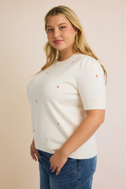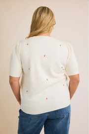 Embroidered Sweater Top w/ Puff Sleeve - Cream