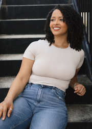 Keywords: short sleeve crop top, women’s crop top, seamless crop top, trendy crew neck top, high-waisted crop top, soft and stretchy crop top, modern wardrobe essential.