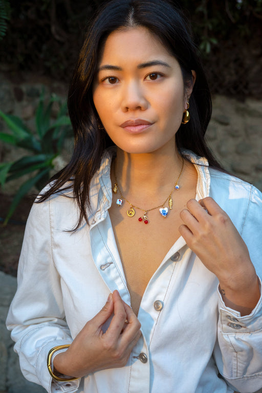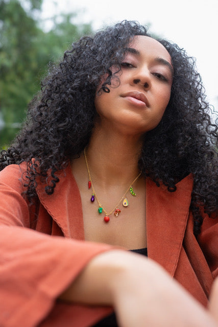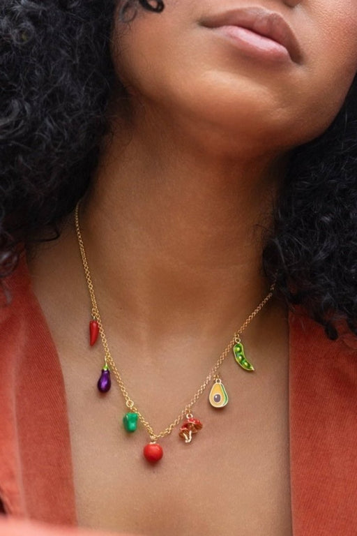 Add a playful pop to any look with the Harvest Necklace—a charming collection of hand-painted fruit charms strung on a dainty, adjustable gold chai...