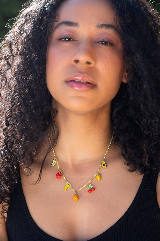 Bring the charm of a sunny market day to your outfit with this fruit-forward statement necklace. Featuring vibrant enamel charms and a luxe gold ch...