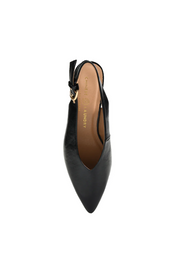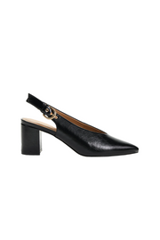The Menny Slingback Pump is a shoe with a sleek pointed toe and a high-cut vamp. The shoe features an adjustable buckle closure and a 2.40-inch block heel. It is made from synthetic materials.