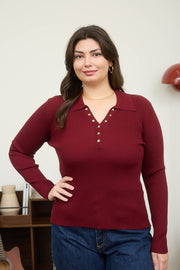 Elevate your wardrobe with this Plus Collared Gold Snap Button Long Sleeve Sweater in Red Wood, perfect for those seeking a fitted, stylish layer. Featuring a collared design, gold snap buttons, long sleeves, and a solid sweater knit, this pullover offers a tailored fit—ideal for casual or dressed-up looks in cooler weather.