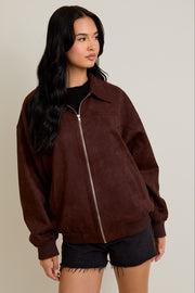 Elevate your outerwear collection with this Long Sleeve Round Oversized Suede Bomber in Dark Brown, perfect for those seeking a stylish yet cozy jacket. Featuring a round neckline, long sleeves, and an oversized suede-like fabric, this bomber jacket offers a relaxed fit—ideal for casual outings or layering in cooler weather.