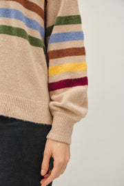 Add a touch of playful sophistication to your winter wardrobe with the Rainbow Stripe Sweater in Beige. Designed for effortless comfort and timeless charm, this pullover features vibrant, multicolored stripes across a soft neutral base — a modern twist on a classic knit. The relaxed, slightly oversized silhouette drapes beautifully, while ribbed details at the cuffs, hem, and neckline add refined texture. Perfect for cozy weekends or casual days out, this luxe knit sweater blends warmth, color, and comfort with ease.