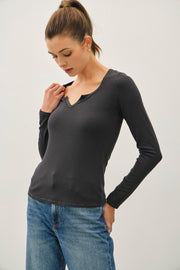 Sleek, minimal, and effortlessly elevated — the Ribbed Notched Neck Top in Dark Charcoal is the ultimate layering essential for the modern woman. The soft ribbed texture and flattering notched neckline bring a refined edge to this everyday basic, while its fitted yet comfortable silhouette enhances your natural shape. Designed in a stretchy rayon blend, it moves with you through every season, pairing beautifully with denim, trousers, or under your favorite blazer for a polished finish.