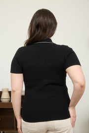Elevate your wardrobe with this Plus Contrast Trim Half Button Sweater Knit Polo in Black, perfect for plus-size fashion lovers seeking cozy polo tops, ribbed knit sweaters, and versatile short-sleeve layers with a modern edge. Featuring a collared design, half button front, subtle contrast trim details, and a soft sweater knit fabric, this polo knit top offers a flattering fit—ideal for casual outings, office looks, or pairing with jeans and skirts.
