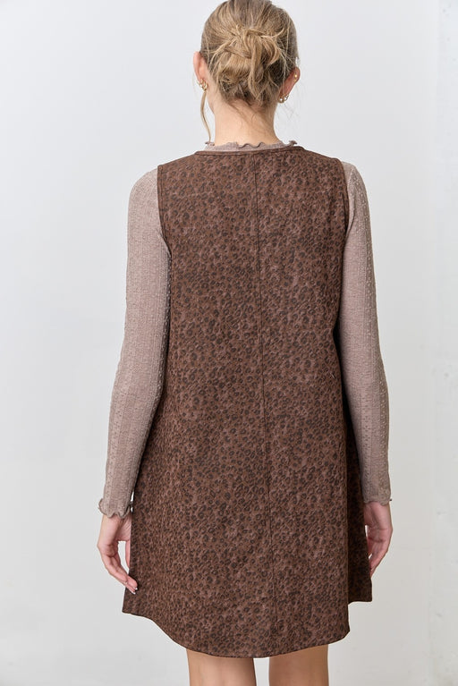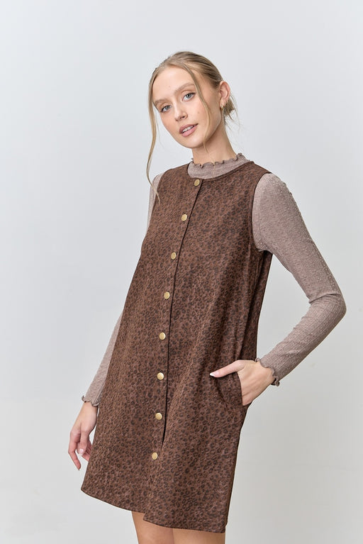 This mini dress is made from a printed denim fabric and features a sleeveless, round-neck design. It has a button-down front and side pockets. The ...