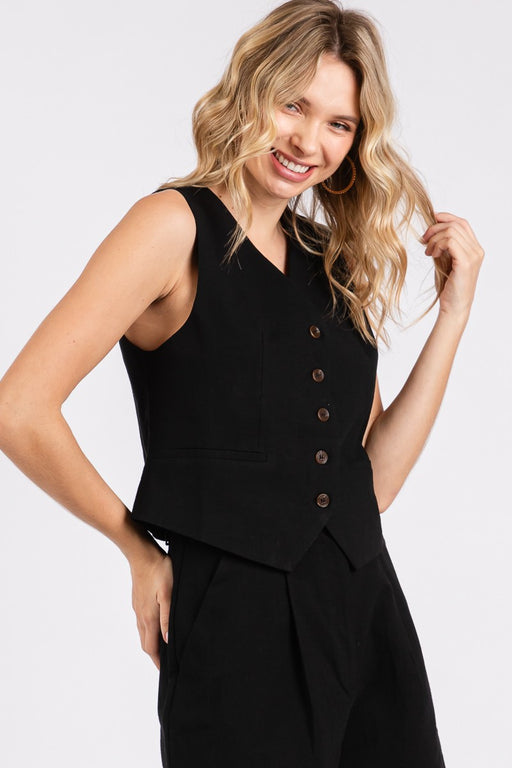 Elevate your wardrobe with this Linen Button-Down Classic Vest in Black, perfect for those seeking a tailored and versatile piece. Featuring a butt...