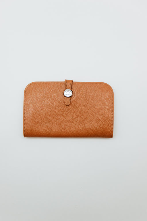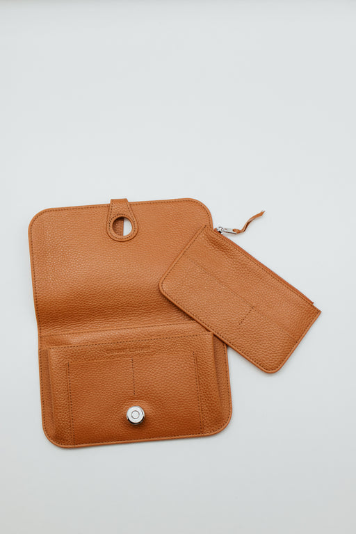 pull tab closure silver hardware 3 card slots 4 extra pockets removable compartment genuine leather dimensions: 7 3/4" x 4 3/4"