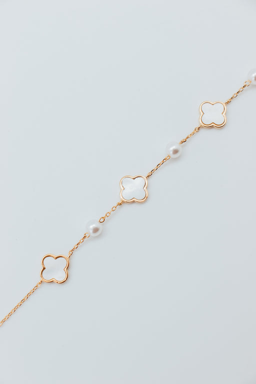 This elegant bracelet features a delicate design of alternating faux pearls and gold-plated mother of pearl clovers. Its adjustable length (6.5"-7....