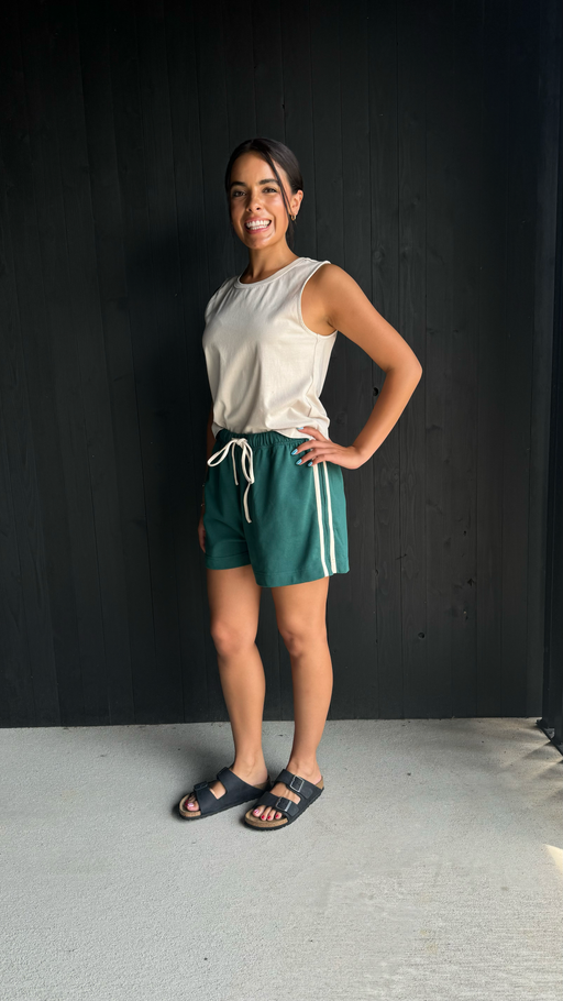 Step out in comfort and style with our Hunter Green Side Striped French Terry Shorts. These shorts feature an elastic waistband with a drawstring f...