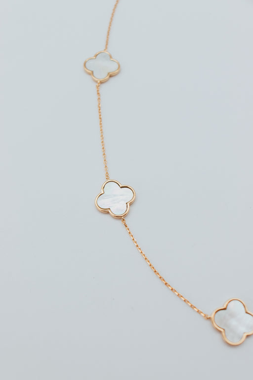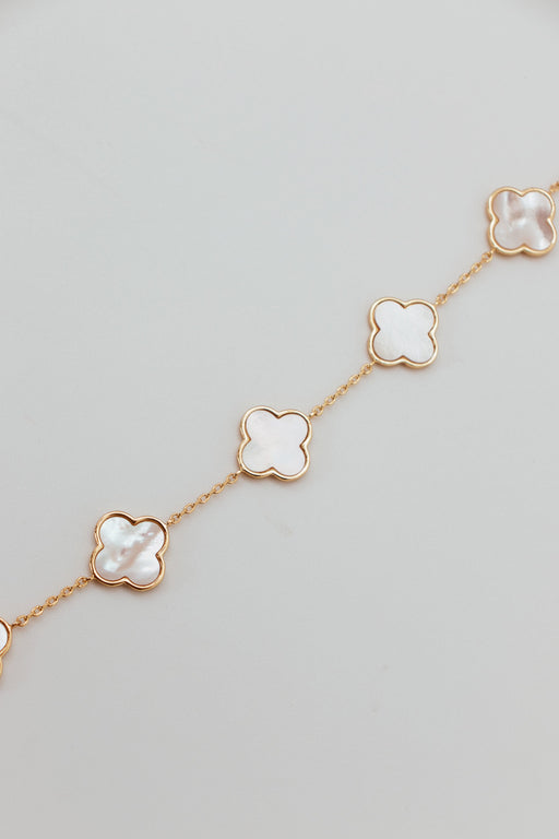 This luxurious bracelet features a unique design with five mother-of-pearl clover stations in gold and white. Handcrafted with precision and attent...