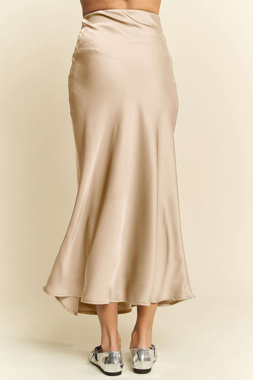 This midi length skirt is a sleek, A-line style that is suitable for casual wear. It has a smooth finish and a neutral cream beige color. The skirt...