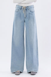 These Super High Rise Drawcord Wide Leg Jeans in a light wash are a comfortable and trendy addition to your denim collection. The jeans feature a super high-rise waist with a drawcord elastic waistband for a perfect fit. They are designed with a pleated, full-length wide leg and a finished hem.