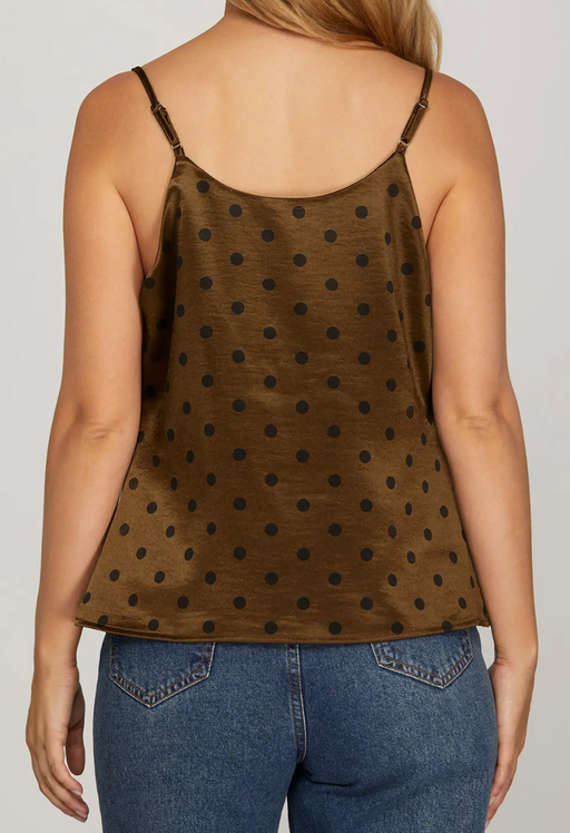 Elevate your look with the Polka Dot Satin Cowl Neck Cami in Bronze — a timeless blend of sophistication and subtle playfulness. Designed with a fl...