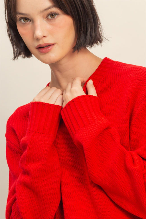 This red cropped knit sweater is designed to bring a cozy charm to your look. It features a classic crew neckline and long sleeves, and is made fro...