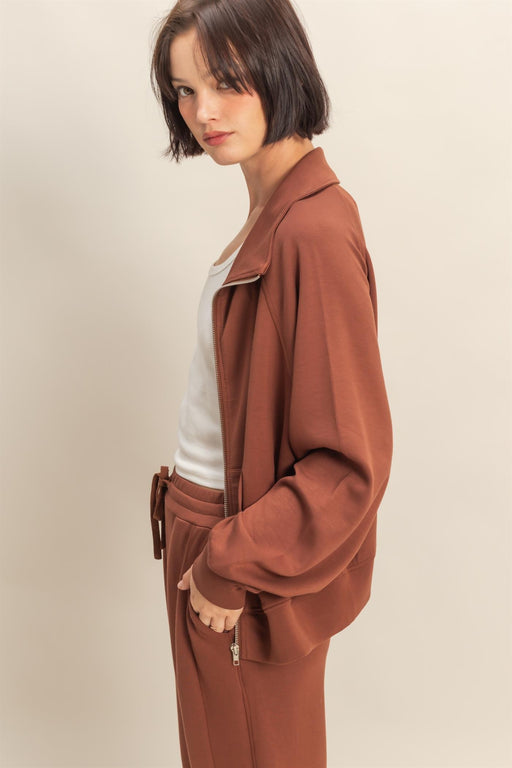 This Sophia jacket in washed taupe has a collared neckline and a full zipper front closure. It features pockets. Product Details: Color: Washed...