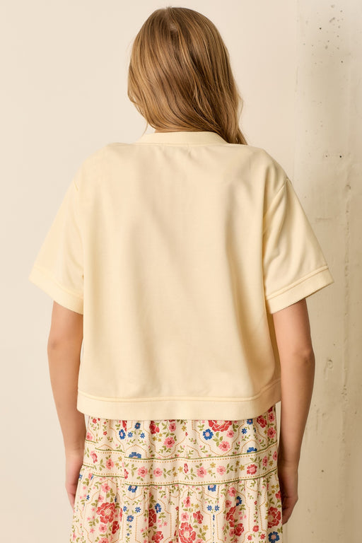 This classic and comfortable button up short sleeve top in a cream color is a versatile addition to your wardrobe. It features a simple round neck,...