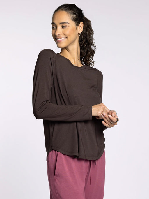 This Stassia top in coffee bean is a long-sleeved shirt with a crew neck and a shirt-tail hem. Product Details: Design: Crew neck, shirt tail h...