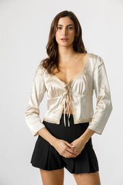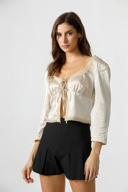 Elevate your wardrobe with this sophisticated Champagne Beige Top in size Large, perfect for those seeking a feminine and versatile blouse. Crafted from silky satin in a soft champagne hue, it features a flattering sweetheart neckline with delicate lace trim, a romantic tie-front detail, and three-quarter-length sleeves for a balanced silhouette. The cropped length and luxurious finish make it ideal for both daytime outings and evening events.